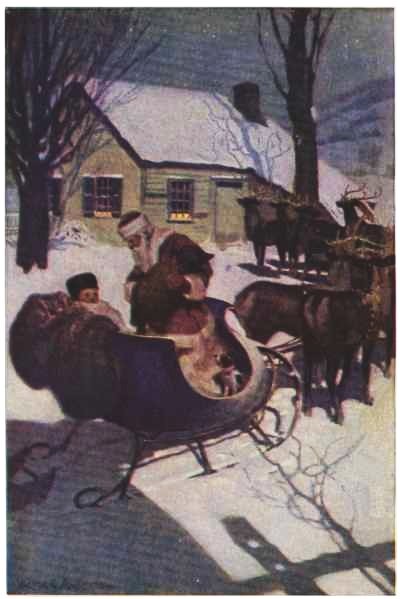 Santa Claus gave Johnny a wink. “That boy is improving,” he said. “He knows some things;” and with that he took out of the case and gave both Tommy and Johnny big heavy coats of whitish fur and two bags made of skin. “And now,” he said, “you will have to be off if you want to get back here before I leave, for though the night is very long, I must be getting away soon,” and all of a sudden the door opened and there was the North Star straight ahead, and at a whistle from Santa Claus away went the dogs, one sled right behind the other, and Sate, galloping for life and barking with joy, alongside.