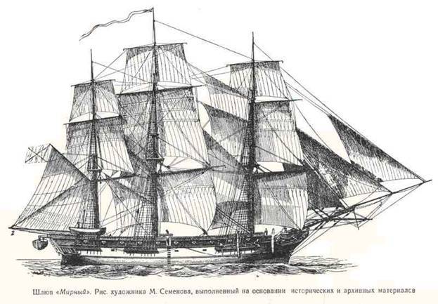 Зато прекрасные мореходные качества показал второй шлюп — «Мирный», построенный русским корабельным мастером Колодкиным в Лодейном поле. Вероятно, проект этого корабля был составлен замечательным русским корабельным инженером И. В. Курепановым, который строил в Лодейном поле однотипный шлюп «Благонамеренный» (всего построил за свою службу 8 парусных линейных кораблей, 5 фрегатов и много мелких судов); Колодкин был только исполнителем этого проекта. Шлюп «Мирный» имел значительно меньшие размеры, и первоначально числился в списках флота в качестве транспорта «Ладога». Он был несколько перестроен, чтобы придать ему внешний вид военного корабля. Кроме того, командир его, прекрасный практик морского дела лейтенант М. П. Лазарев, приложил много стараний в подготовительный период перед отправлением в дальнее плавание, чтобы улучшить мореходные качества этого шлюпа (он был снабжен второй обшивкой, сосновый руль был заменен дубовым, были поставлены добавочные крепления корпуса, такелаж был заменен более прочным и т. д.), построенного, правда, из хорошего соснового леса с железным креплением, но рассчитанного для плавания в Балтийском море. М. П. Лазарев дает положительную оценку своему шлюпу: однотипные «Мирный» и «Благонамеренный», по его словам, «оказались впоследствии самыми удобнейшими из всех прочих как по крепости своей, так вместительности и покою: один лишь недостаток против «Востока», и «Открытия» был ход», и далее: «своим же шлюпом я был очень доволен», и «стоя в Рио-де-Жанейро, капитан Беллинсгаузен почел за нужное для скрепления «Востока» прибавить ещё 18 книц и стандерсов; «Мирный» же ничем не жаловался».[18] И Беллинсгаузен и Лазарев неоднократно сетуют на то обстоятельство, что в обе дивизии были включены по два совершенно разнотипных корабля, значительно друг от друга отличающиеся по скорости хода. Беллинсгаузен пишет по поводу переименования транспорта «Ладога» в шлюп «Мирный»: «не взирая на сие переименование, каждый морской офицер видел, какое должно быть неравенство в ходу с шлюпом «Востоком», следовательно, какое будет затруднение оставаться им в соединении и какая от сего долженствовала произойти медленность в плавании».[19]