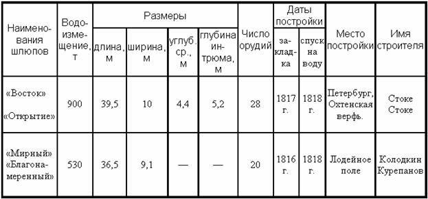 Выбор кораблей. Как уже отмечалось, по желанию правительства обе экспедиции снаряжались в весьма спешном порядке, ввиду чего в состав их были включены не специально построенные для плавания во льдах парусные корабли, а находившиеся в постройке шлюпы, предназначавшиеся для отправления в обычные кругосветные плавания. Первая дивизия состояла из шлюпов «Восток» и «Мирный», вторая из шлюпов «Открытие» и «Благонамеренный». Основные данные этих шлюпов приведены в табл. 1.