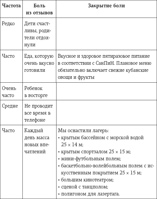 На что Саша сделал ставку? На то, что дети проживают в комфортабельных корпусах, оборудованных кондиционерами, комнаты на четверых, в каждой из которых есть туалет и душ (боль – плохие корпуса); на вкусное и здоровое пятиразовое питание, когда меню включает свежие кубанские овощи и фрукты (боль – плохое питание); на то, что море дети посещают организованными группами, купаются в огороженной зоне под наблюдением спасателей (боль – безопасность); на ежедневные мероприятия, в ходе которых дети обучаются и развиваются в игровой форме, каждый ребенок чувствует себя частью дружной команды, где он – важное звено (боль – скука и сосредоточенность детей на гаджетах).