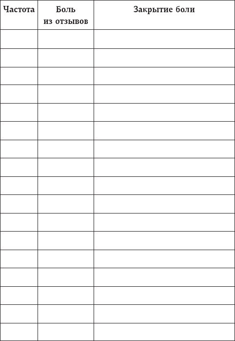 По сути, это таблица, в которую мы сначала выносим боли из отзывов, стремясь использовать сленг ЦА. Вы видите отзыв, и вам нужно скопировать фразу из него, потом подумать, как вы можете ее закрыть. Вам нужно дать ответ, но не просто «мы самые классные, опытные, красивые», а содержащий довод, почему вы достойны доверия. Например, если вы пишете о том, что на вашей ветстанции трудятся опытные врачи, то укажите, сколько семинаров прошел каждый из них, какой у них опыт, с какими животными они работали. Давите на конкретные факты, забудьте об общих формулировках – это самая большая ошибка, которую совершают администраторы. Только факты, и ничего кроме них. Не можете закрыть боль – пока пропустите ее. После этого пометьте, как часто встречается данная проблема ЦА, и, пожалуйста, не субъективно, а ориентируясь на реальную частоту повторений в отзывах.