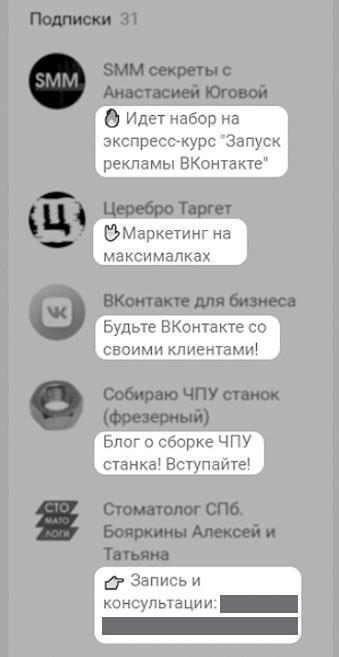 Зато публичные страницы отображаются в блоке «Подписки» (он находится слева страницы под блоком «Друзья») у каждого подписчика вашего сообщества, а значит, приносит дополнительный бесплатный (!) трафик. Когда человек подписывается на новый паблик, то данное сообщество автоматически отображается на четвертом-пятом месте в блоке «Подписки», а если заходит регулярно, то поднимается до первого—третьего мест. Это дает нам дополнительную рекламу без затрат с нашей стороны, так как у представителей целевой аудитории с большой вероятностью в друзьях будут те, кто разделяет их интересы (читай: наши потенциальные клиенты).