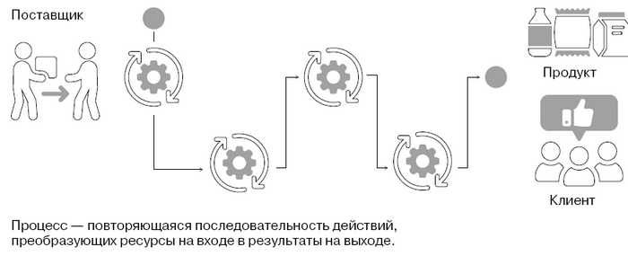 • Процесс должен преобразовывать ресурсы в конкретные результаты. Под ресурсами может пониматься все что угодно: древесина, информация, решения коллегиальных органов и т. д.