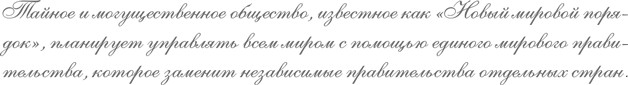 Тайное и могущественное общество, известное как «Новый мировой порядок», планирует управлять всем миром с помощью единого мирового правительства, которое заменит независимые правительства отдельных стран.
