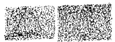 На некоторых картинках, как на той, что слева, имелись слабозаметные изображения, в данном случае — парусный кораблик. На других, вроде той, что справа, не было ничего, кроме произвольно расположенных штрихов. Студенты должны были сказать, видят ли они осмысленный рисунок. Почти все заметили кораблик и другие настоящие изображения. Интересно, что многие участники признавались, что видят рисунок там, где на самом деле были только случайные пятна. На 12 картинках не было изображено ничего осмысленного. В среднем на девяти из них студентам виделись рисунки.