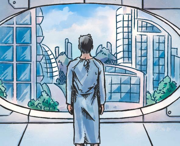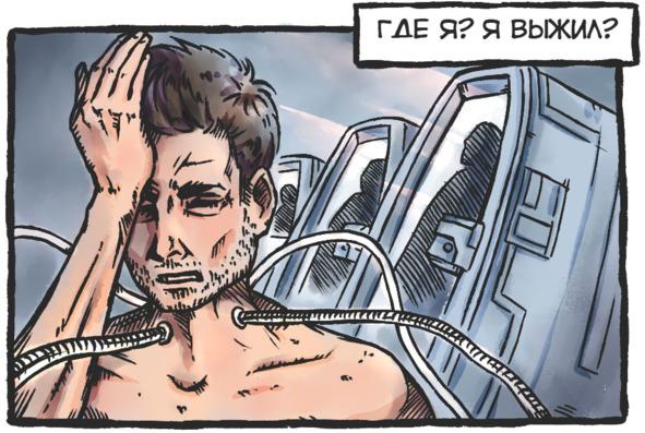 Шоковое состояние Алексея начало проходить, и только теперь он смог немного оглядеться и понять, что находится не на больничной кушетке, а в открытой прозрачной капсуле, а его палата представляет собой длинное светлое помещение с огромными круглыми окнами. Бесконечный ряд закрытых капсул, с людьми внутри, уходит далеко вглубь помещения. И лишь вдалеке отчётливо видна ещё одна открытая капсула, у которой сидят два человека и молча смотрят на голограмму девушки, монотонно объясняющую суть исправительной программы. Судя по всему, на Земле только что произошла ещё одна смерть.
