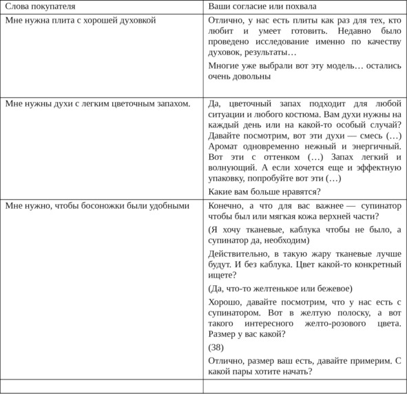 ВАЖНО: если покупатель не уверен в своем выборе, но не говорит, что ему не нравится, спросите прямо, что его смущает. Когда он ответит, встаньте на его сторону, выразите понимание, порассуждайте вместе с ним («давайте мы с вами подумаем…»).