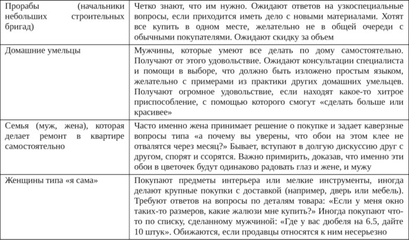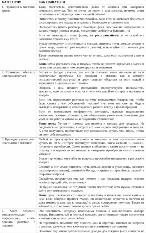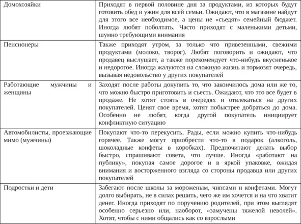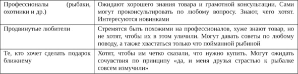 основывается на разделении всех покупателей на некие категории, или группы людей, посещающих магазин с определенной целью и ведущих себя в магазине тем или иным образом. Если мы знаем, к какой категории относится покупатель, зачем пришел в магазин и чего он ожидает от работы продавца-консультанта, нам проще строить с ним беседу, т. е. правильно определить его потребности и подобрать нужный ему товар.