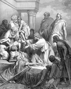 25 Когда же народ был выслан, Он, войдя, взял ее за руку, и девица встала.