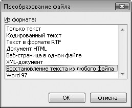 3. Выберите в этом окне вариант Восстановление текста из любого файла и нажмите кнопку OK.