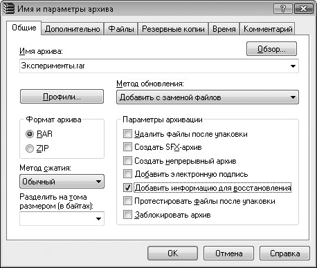 Формат RAR предусматривает внесение в архив избыточной информации – так называемойинформации для восстановления сразу при его создании. Для этого при добавлении файлов в архив в окне Имя и параметры архива необходимо установить флажок Добавить информацию для восстановления (рис. 1.5). По умолчанию этот флажок снят. На вкладке Дополнительно задается относительный размер информации для восстановления в процентах от общего размера архива.