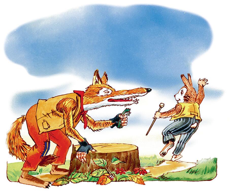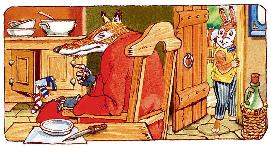 Прибегает, слышит – стонет кто-то. В дверь заглянул и видит – сидит Лис в кресле, весь закутанный в байковое одеяло, а вид у него слабый-слабый. Глянул Кролик по сторонам – нигде не видно обеда. Миска стоит на столе, а рядом острый ножик.