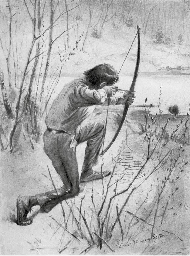 Можно было бы прокрасться по берегу запруды на расстояние выстрела, однако Куонеб поспешил назад в вигвам и сменил ружье на охотничье снаряжение своих предков: лук, стрелы и длинную леску. Ондатра мирно грызла корневище аира [3], не подозревая, что в пятнадцати шагах от нее индеец уложил леску аккуратными кольцами на землю, привязал конец к стреле и натянул тетиву. Вззз! Стрела, разматывая леску, пронзила цель.