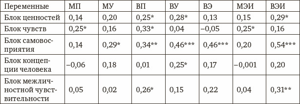 Примечания:МП – понимание чужих эмоций; МУ – управление чужими эмоциями; ВП – понимание своих эмоций; ВУ – управление своими эмоциями; ВЭ – контроль экспрессии; МЭИ – межличностный эмоциональный интеллект; ВЭИ – межличностный эмоциональный интеллект. * p< 0,05; ** p< 0,01; *** p< 0,001.
