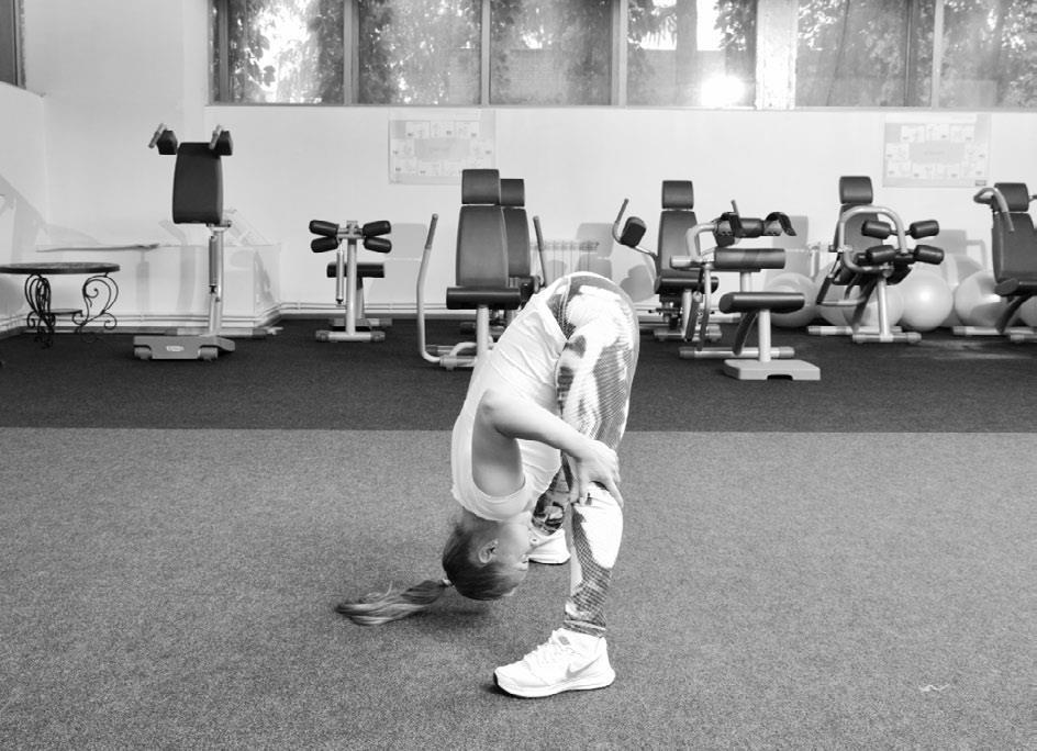 Что же это за упражнения? Каждые 2–3 часа, в крайнем случае 4, нужно вставать со стула или выходить из машины и, создав неподвижную опору для ног, упираясь руками в колени, постараться растянуть позвоночник и ноги, сделав упражнение «складной нож», то есть согнуть туловище как можно больше, стараясь опустить руки на пол на продолжительном выдохе «Х-х-а-а» (не путать со словом «ой») (см. фото 1 абв). После этого, выпрямившись и поставив ноги как можно шире плеч, поверните туловище к любой ноге, при этом впередистоящая нога смотрит носком вперед, а стопа другой ноги стоит ей перпендикулярно. Медленно, на выдохе, наклониться вперед (руки при этом скользят по ноге), стараясь коснуться руками земли возле впередистоящей ноги. Ногу ни в коем случае не сгибать в коленном суставе, даже чуть-чуть (фото 2 аб). При этом вы можете ощущать болезненность по задней поверхности ноги и в области поясничного отдела позвоночника. Не бойтесь этого. Медленное выполнение данного упражнения на выдохе или нескольких выдохах за одно движение не может ничего ущемить и ухудшить. Эти упражнения я называю декомпрессионными. Они являются хорошей профилактикой как для предотвращения острых болей в спине, так и для избавления от этих болей. Но в каждом случае упражнения вызывают болезненность. И чем запущеннее ваша спина, тем труднее выполнять упражнение. Я часто говорю: «Боль – это друг, только со знаком минус». Если не будет боли, которая предупреждает человека о какой-то поломке в организме, то человек может погибнуть. В то же время, умея пересилить боль, можно не только вылечить самые тяжелые заболевания, но и укрепить тело и дух, избавившись от необходимости принимать обезболивающие таблетки.