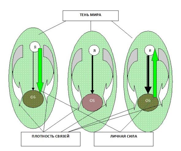 Есть СИЛА («ТЕНЬ МИРА») связывающая все объекты в единое целое. Её можно представить, как окружающее нас поле с определённой (хотя и меняющейся) плотностью. И есть связи, которые мы сами создаём своими действиями. Если их плотность меньше, чем плотность поля, то действие требует от нас затраты сил, если она равна плотности поля, то действия совершаются почти автоматически, а если она больше плотности поля, то мы получаем из него дополнительную энергию.