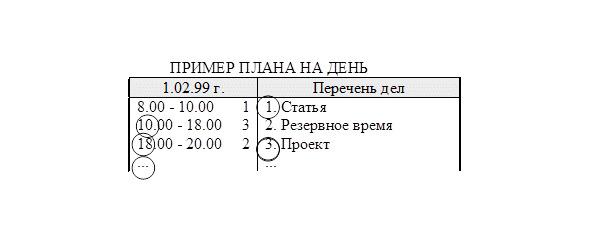 Когда я возвратился в Н. Новгород, то вспомнил, что мой «план дел» опять полетел в тартарары. Но каково было мое удивление, когда, открыв бумаги, я увидел, что для этой незапланированной командировки у меня была зарезервирована целая неделя. Это был мой первый план, когда я выполнил абсолютно все запланированные дела. С тех пор я постоянно пользуюсь этой системой планирования. Попробуйте сами и вы убедитесь в ее эффективности.