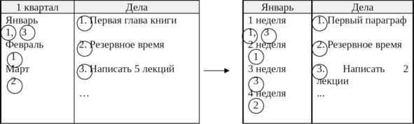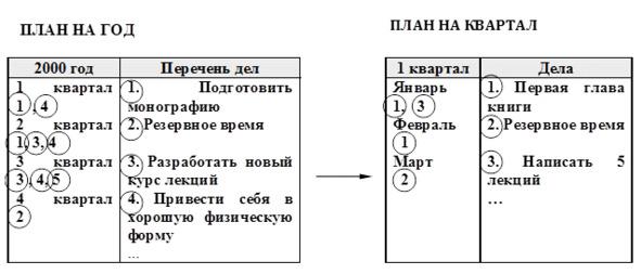 На основе годового плана по этой системе разработайте план на квартал, взяв из плана на год обязательные пункты для исполнения, не забудьте при этом запланировать резервное время. А на основе квартального плана подготовьте программу на предстоящий месяц, которая в свою очередь предполагает недельное и дневное планирование. Очевидно, что когда из плана квартала составляется план на месяц или из недельного — план на день, то в перечне дел на более короткие отрезки времени появятся дополнительные дела, которые могут отсутствовать в плане на большие отрезки времени.