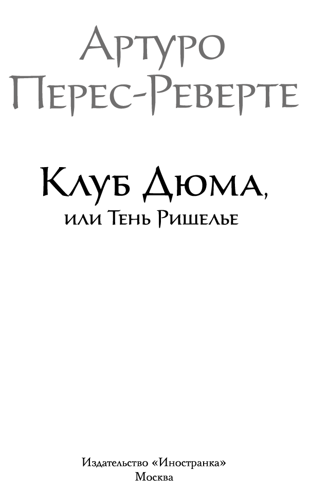 Клуб Дюма, или Тень Ришелье : роман / Артуро Перес-Реверте ; пер. с исп. Н. Богомоловой. — М. : Иностранка, Азбука-Аттикус, 2022. — ил. — (Большой роман).