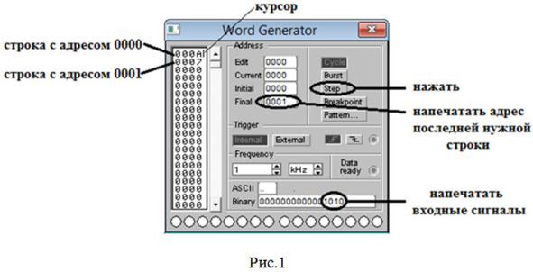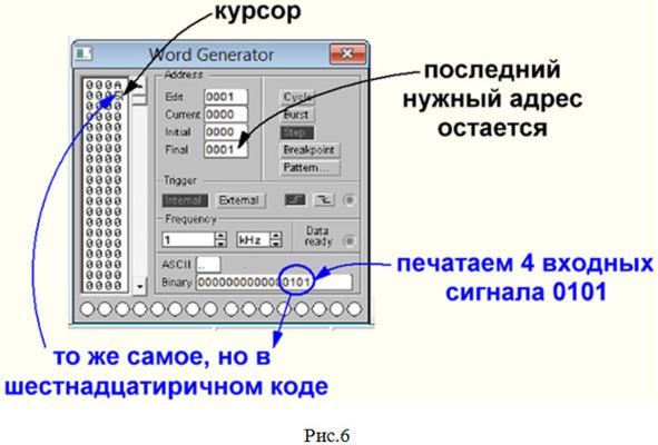 4. В пункте 2 предварительного задания задаются две комбинации входных сигналов: красным и синим цветом на рис.3. Поэтому в левой колонке генератора сигналов будем использовать две строки с адресами 0000 и 0001. Последний адрес 0001 указываем в окошке Final генератора сигналов (рис.5).