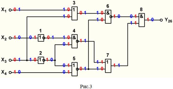 2. Выполняем (рис.3) анализ работы схемы в статическом режиме по заданным значениям входных сигналов: указываем значения сигналов на входах и выходах всех элементов. Для входных сигналов, указанных более мелким шрифтом — красным цветом, более крупным шрифтом — синим.