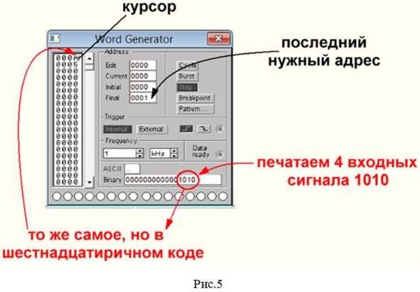 6. В окошке Binary (двоичный) печатаем (рис.5) 4 входных сигнала 1010, указанных мелким шрифтом в задании или красным цветом на рис.2. Эти 4 сигнала указываем в конце, так как именно последние 4 выхода генератора сигналов (смотрите рис.4) используются для подачи сигналов на входы.
