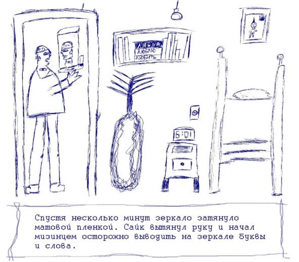 Спустя несколько минут зеркало затянуло матовой пленкой. Сайк встал, радостно поглядел на пустую поверхность зеркала. Он осторожно вытянул руку и начал мизинцем выводить на зеркале буквы и слова.