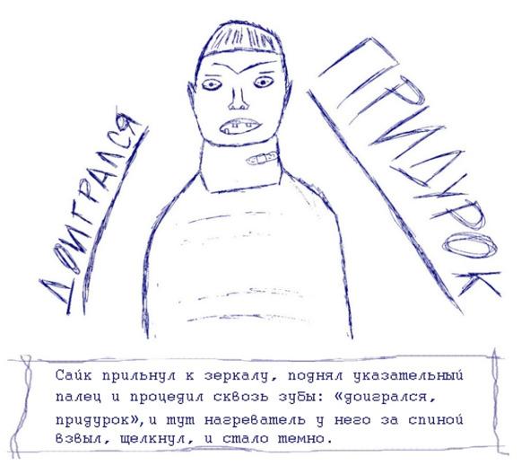 Сайк метался по парилке больше часа. Гудение нагревателя превратилось в гул в ушах, лицо жарко пульсировало, по нему текли капли. Рубашку и штаны он содрал несколько зеркал назад, они валялись около нагревателя скомканными мокрыми тряпками. В очередной раз отойдя от зеркала Сайк почувствовал, что ему тяжело дышать, и дико заныла шея. Он смахнул с зеркала не успевшие запотеть буквы и увидел, что его заплаты пластырем на шее стали красные от крови. Раны разбухли, повязки на бедрах и бицепасах тоже стали розовые. Сайк прильнул к зеркалу, поднял указательный палец и процедил сквозь зубы: «доигрался, придурок», и тут нагреватель у него за спиной взвыл, щелкнул, и стало темно.