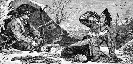 Washington's army, as we have seen, had encamped at Valley Forge, where the soldiers lived in rude log huts. They were without proper food or clothes, and cowered miserably over camp fires, for which they had to carry wood on their backs from neighboring forests. Even General Washington had but one room, and lived on cabbage and potatoes, with a few hickory nuts for dessert from time to time.