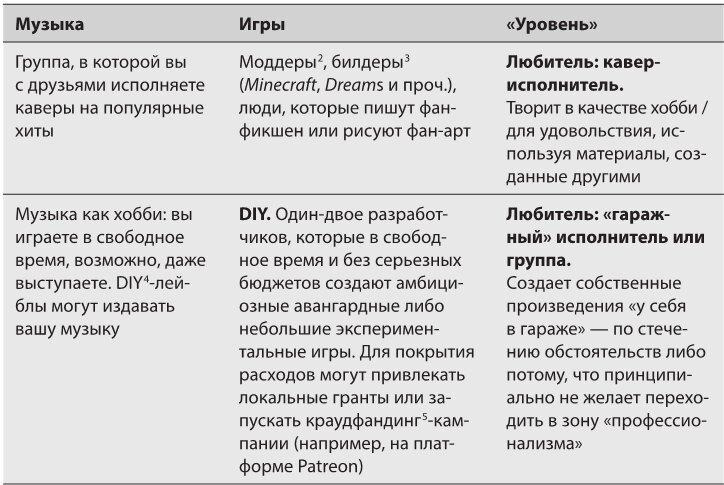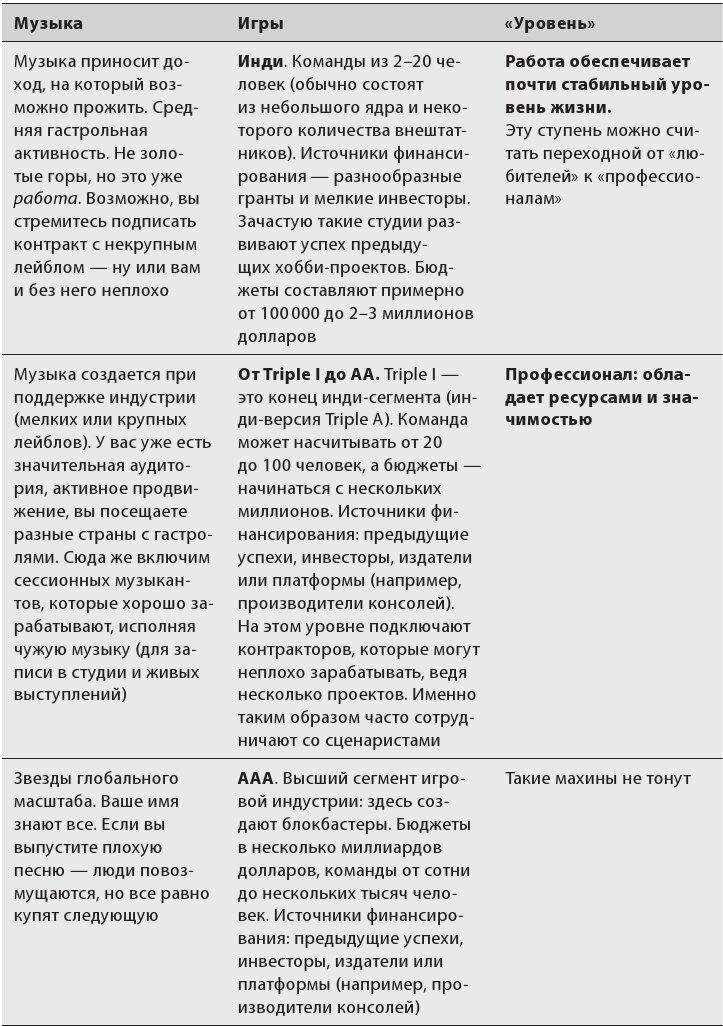 В таблице ниже я попыталась сопоставить аналогичные «уровни» [10] в музыкальной и игровой индустриях. В каждом случае я указала примерный масштаб бюджетов и численность персонала.