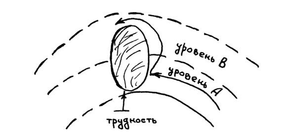 Трудность появляется на прежнем уровне А. Для её преодоления надо перейти на более высокий уровень сознания В (рис.1).