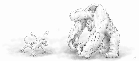 Первые и самые древние чем-то напоминали черепах. Это были наши союзники. Всё их тело было покрыто защитными наростами. Рост около трёх метров. Две огромные толстые руки у них сформировались гораздо больше ног. Двигались медленно. Ходили часто не только ногами, а ещё и с помощью рук. Бегали редко и неохотно. Раньше они жили в пещерах, потом начали строить каменные крепости и другие постройки.