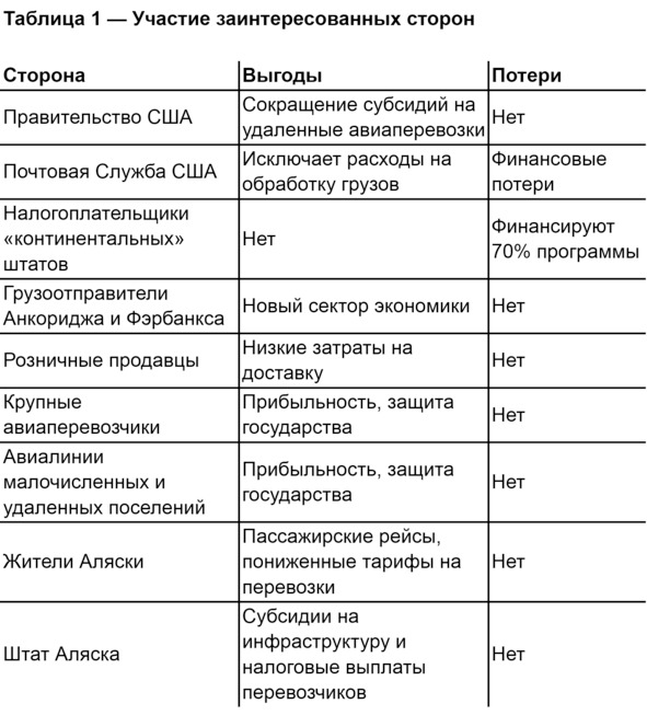 Наряду с прямым субсидированием через эту программу, федеральное правительство предложило оказывать финансовую поддержку местным авиалиниям для осуществления почтовых перевозок. В результате ряда законодательных и организационных изменений была принята схема, согласно которой федеральное правительство финансирует Почтовую Службу США из средств федерального бюджета, а Почтовая Служба направляет 70% средств местным авиаперевозчикам (Табл. 1).