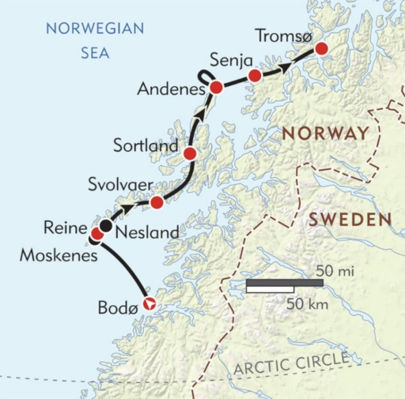 В летний сезон в Северной Норвегии действует предложение, привлекающее активных туристов со всего мира — пеший туризм через острова Норвежского моря. Все маршруты пролегают к северу от полярного круга, самый протяженный из них связывает города Бодё и Тромсё и пересекает Лофотенские острова, Вестеролен и Сенья (Рис. 5). Продолжительность тура составляет 12 дней.