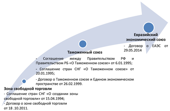 Подводя итог, обозначим основные этапы развития евразийской экономической интеграции на постсоветском пространстве, приведшие к созданию Евразийского экономического союза, в виде следующей схемы на рисунке 1:
