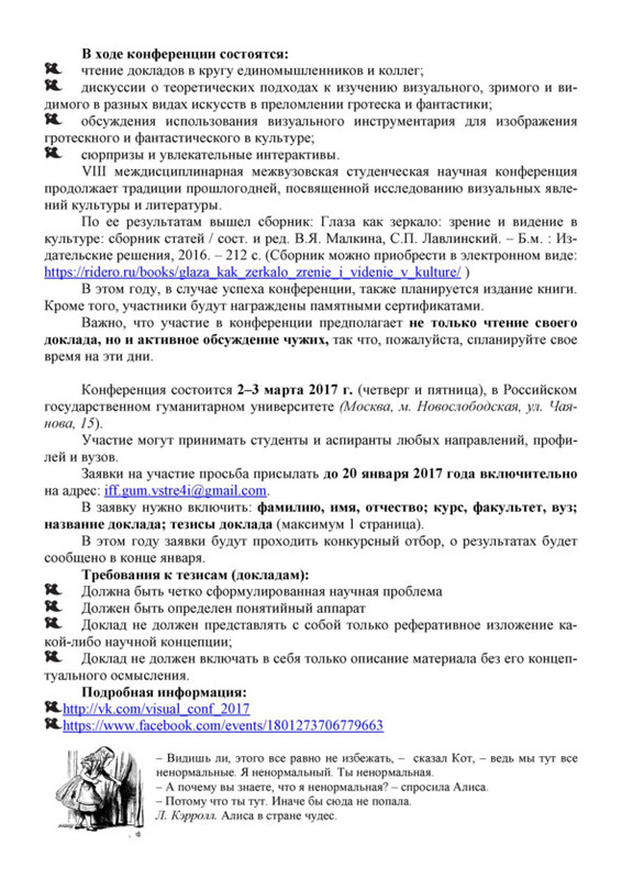 2 и 3 марта 2017 года в Институте филологии и истории РГГУ прошла VIII межвузовская студенческая научная конференция «Гротескное и фантастическое в культуре: визуальные аспекты», организаторами которой, как и в прошлые годы, выступили проект «Гуманитарные встречи» (студенческое научное общество ИФИ) и спецсеминар «Визуальное в литературе» под руководством С. П. Лавлинского и В. Я. Малкиной.