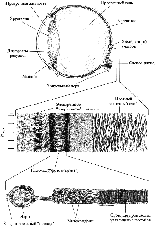 А пока что я собираюсь вслед за Пейли привлечь внимание к тому, насколько грандиозна предстоящая нам задача – объяснить невероятную степень сложности биологических объектов, а также красоту и изящество их устройства. Глава 2 представляет собой развернутое обсуждение одного конкретного примера – “радара” у рукокрылых, открытого через много лет после Пейли. А здесь, в настоящей главе, я разместил изображение глаза (рис. 1) – ах, как бы понравился Пейли электронный микроскоп! – вместе с двумя последовательными увеличениями отдельных участков. В верхней части рисунка можно увидеть весь глаз в разрезе. При таком увеличении глаз выглядит как оптический прибор. Сходство с фотоаппаратом очевидно. Диафрагма радужки отвечает за постоянное изменение апертуры, или f-числа. Хрусталик – линза, причем не единственная, а часть сложной системы линз – та, что обеспечивает фокусировку. Наведение на резкость осуществляется сжиманием хрусталика при помощи мышц (а у хамелеонов – перемещением его взад-вперед, как и в камерах, созданных человеком). Изображение отбрасывается на сетчатку, расположенную сзади, и возбуждает там фотоэлементы.