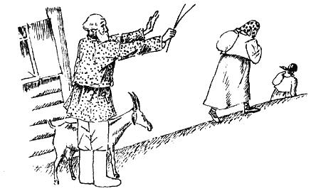 Послал дед свою жену. «Смотри, говорит, хорошенько паси козочку, чтобы сыта была!» Повела она козу, вечером стала гнать к дому, а дед спрашивает: «Козочка моя милая, козочка моя славная! Пила-ли ты вволю, ела-ли ты до сыта?»