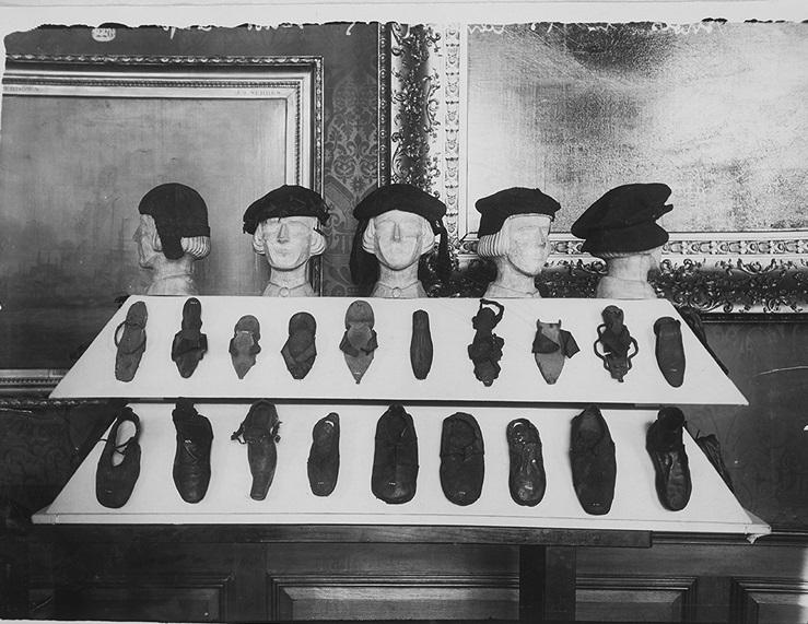 1.1. Неизвестный фотограф, снимок из публикации. Около 1912. «Костюмы, поступившие в Лондонский музей в Кенсингтонском дворце. Тюдоровские береты (верхний ряд) и обувь XV века (нижние ряды)». Из фотоальбомов Музея Лондона, архивы Музея Лондона © Музей Лондона