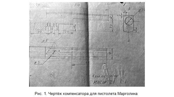 На рисунке 1 чертёж компенсатора для пистолета Марголина, который я начертил для его изготовления на заводе. Это был мой личный платный заказ. Воронил потом этот компенсатор я самостоятельно, разогрел его в пламени конфорки кухонной газовой плиты и опустил в масло.