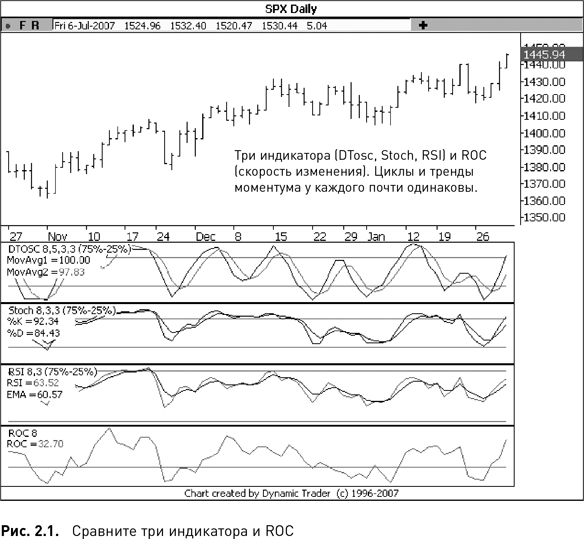 В чем суть этого сравнения? Большинство основанных на цене индикаторов показывают примерно одно и то же, т.е. что циклы моментума совершаются и вызывают ответную реакцию примерно в одно и то же время. Параметры настройки любого индикатора, включая ретроспективный период, можно подстраивать для различных рынков и таймфреймов так, чтобы получать наиболее надежные сигналы. Но, как вы можете судить по рис. 2.1, даже без подстройки параметров все индикаторы отражают циклы моментума одинаково хорошо. Далее в этой главе вы узнаете, как выбрать лучшие параметры настройки любого индикатора для любого рынка и таймфрейма.