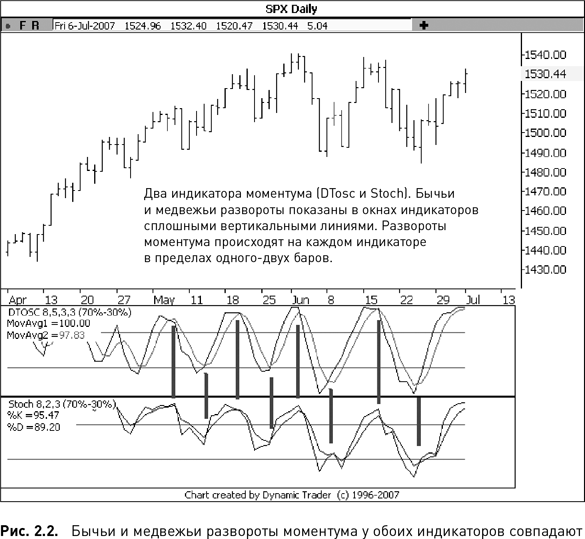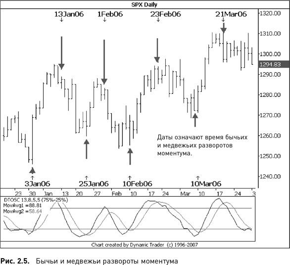 Рис. 2.5 включает дневные данные SPX за приблизительно три месяца и индикатор моментума DTosc. Показаны даты каждого разворота моментума. В верхней части графика указаны даты медвежьих разворотов моментума, а в нижней — даты бычьих разворотов.