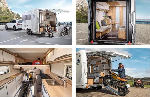 Единственным Европейским представителем каравана для перевозки техники является модель «Knaus Deseo Transport». Этот трейлер имеет огромную заднюю дверь, которой нет ни в одном другом жилом прицепе, ни у одного производителя. Двойной усиленный каркас двери на массивных петлях, поддерживаемый огромными газовыми амортизаторами, герметизированный от пыли и грязи толстым резиновым уплотнителем, является трапом для заезда техники, дает дополнительное место, где можно посидеть на улице, даже если идет дождь. А за отдельную плату производитель предлагает еще палатку от непогоды для этой двери (1,7 м х 1,86 м). В передней части каравана установлена компактная кухня, душевая кабина с комбинированным туалетом, и одно спальное место сзади, которое опускается сверху, если нет техники. Такой трейлер очень востребован любителями мотоспорта.