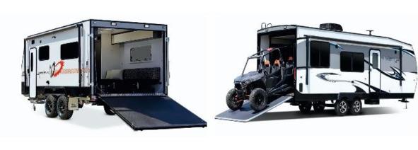 На Американском и Австралийском рынке жилых прицепов выбор больше, чем в Европе. Но все жилые прицепы рассчитаны на транспортировку только тяжелыми внедорожниками. В отличии от Европы, такой караван для перевозки техники разделен на два отсека: гараж для и жилая зона, которая оснащена с американским размахом: полноразмерный холодильник, большая кухня, огромная душевая кабина, туалет, и, конечно, спальные места. На борту имеется не только газовое оборудование, большим запасом воды, но и встроенный генератор с рабочим выходным напряжением бортовой сети 110В / 60Гц. Эти трейлеры оснащены электрическими тормозами, с блоком управления, установленным внутри тягача. Если вам необходим караван с возможностью перевозки АТВ (квадроцикла) или снегоход для соревнований, то это будет правильный выбор.