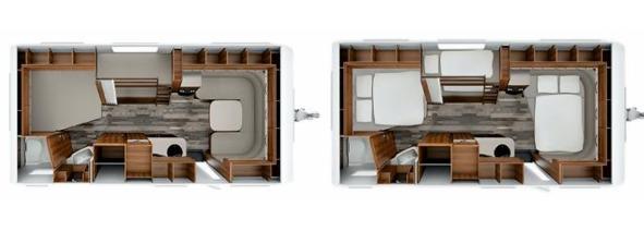 Рисунок 1.5. Полуприцеп «Fifth-wheel». Снизу пример планировки: справа выдвинут один из слайдеров. Впереди вход в спальную зону, которая находится в алькове трейлера, в передней части.