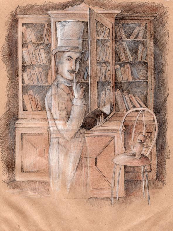 Мальчик уже почти уснул, как вдруг из книжного шкафа осторожно высунулась чья-то голова. Голова была круглой и полупрозрачной. На ее макушке красовался черный цилиндр.