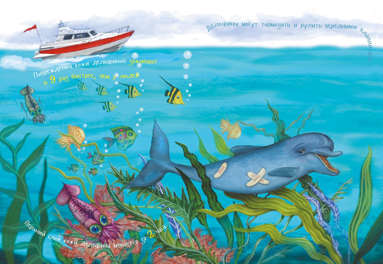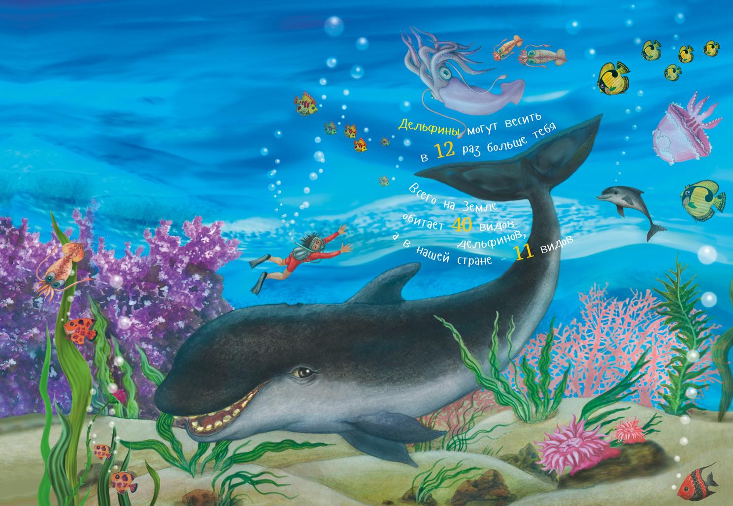 А-а! Я дельфи́н из лучшего в мире отряда китообразных. Наш весёлый народ живёт в воде. Но мы не молчим, как рыбы, мы — умные, разговорчивые млекопитающие. Дельфины бывают морские и речные. Я, например, морской. Пресная вода скучная, а я люблю кудрявые волны и солёные шутки, они бьют из меня фонтаном, как из кита. Дельфиньих родов миллион! Думаете, я сочиняю? Вообще-то, да... Но их правда много. Самый известный среди нас — афали́на. Это мой вид, мы живём в Чёрном и Средиземном морях. Мы очень разные! Самые большие дельфины — косатки, они весят 8 тонн. Многие даже думают, что это настоящие киты, — из-за их гигантского размера! Самые маленькие дельфины — мауи, обитающие в Новой Зеландии. Вес мауи около 50 килограммов, в 3–6 раз меньше, чем у меня.