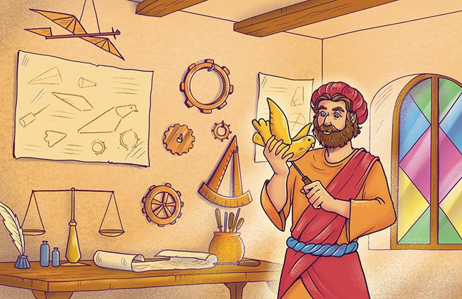 — Мы в древнегреческом городе Таренте, в мастерской учёного Архита, Чевостик. Видишь, как много на столах и на стенах разных приборов, шестерёнок, весов. Архит — изобретатель. Он очень занят. Сегодня первое испытание его нового изобретения — механического голубя.