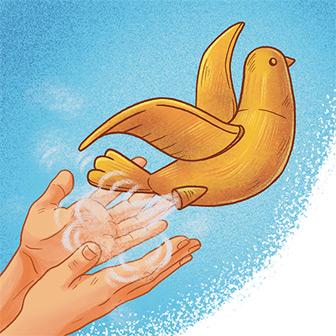 — Вижу, дядя Кузя! Он поднимает над головой деревянную птицу, что-то подкручивает, из птицы вырывается пар. Ой, полетел, полетел! Машет крыльями! Как он летит, на батарейках?