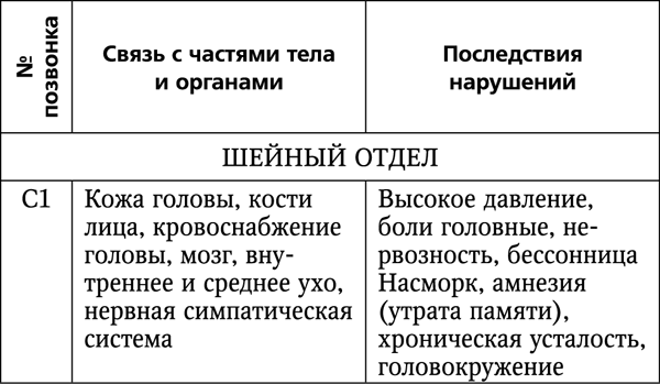 Таблица 1. Последствия нарушения иннервации спинномозговых сегментов